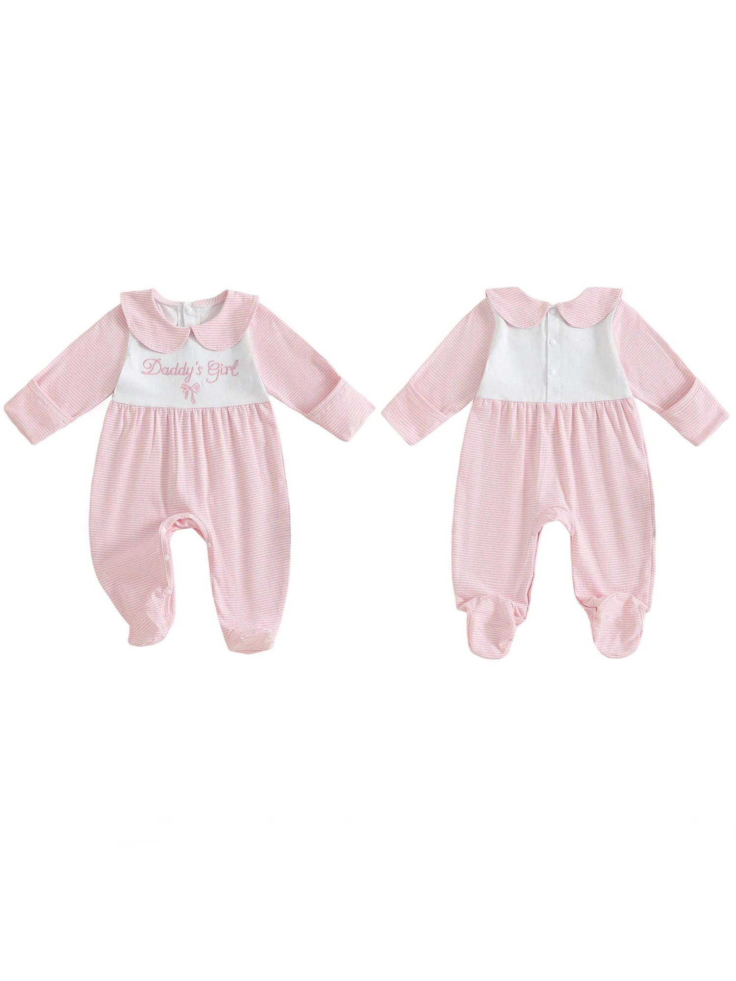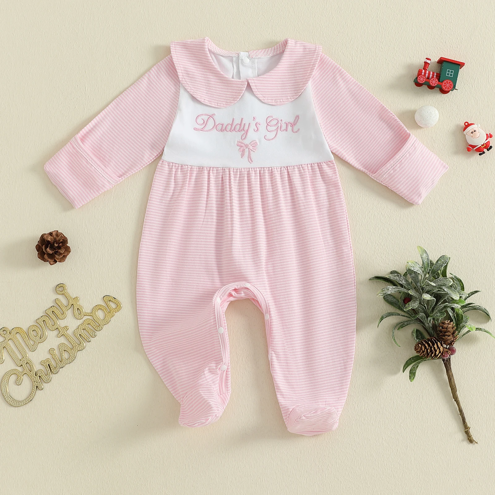 Infant Girls Autumn Romper with Striped Print and Embroidered Letters Long Sleeves Peter Pan Collar and Full-Length Design