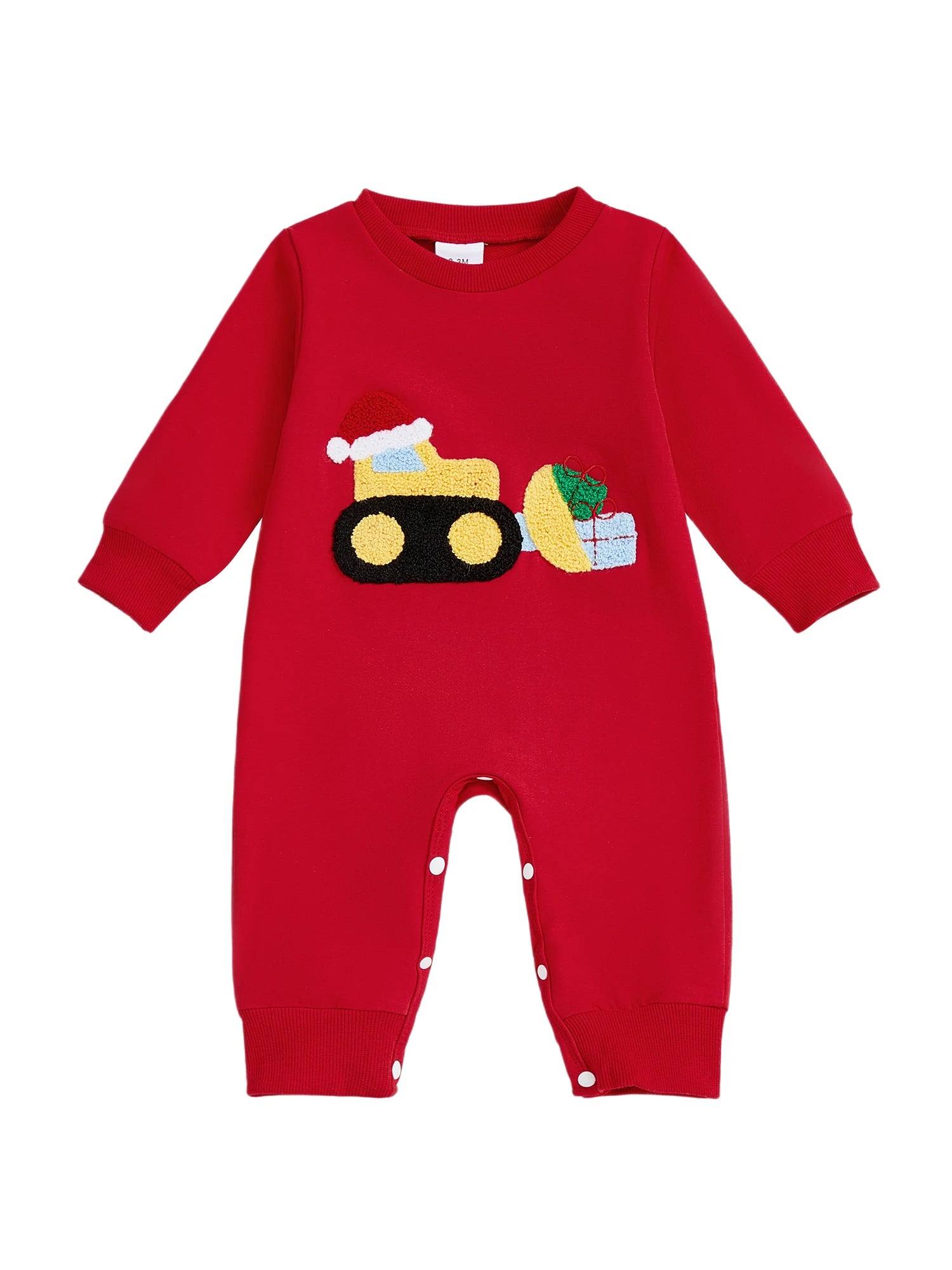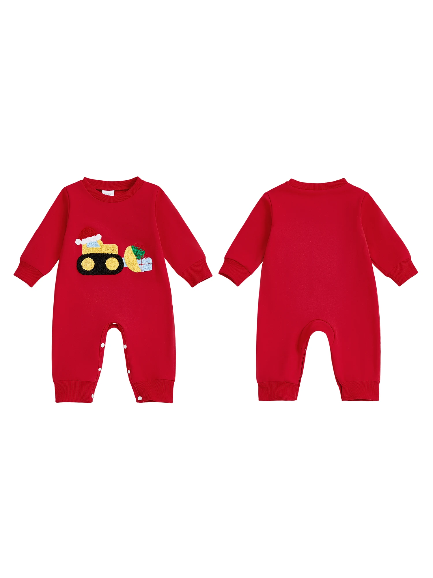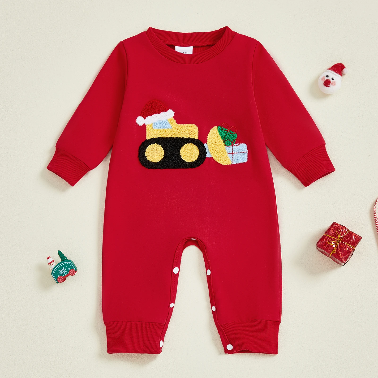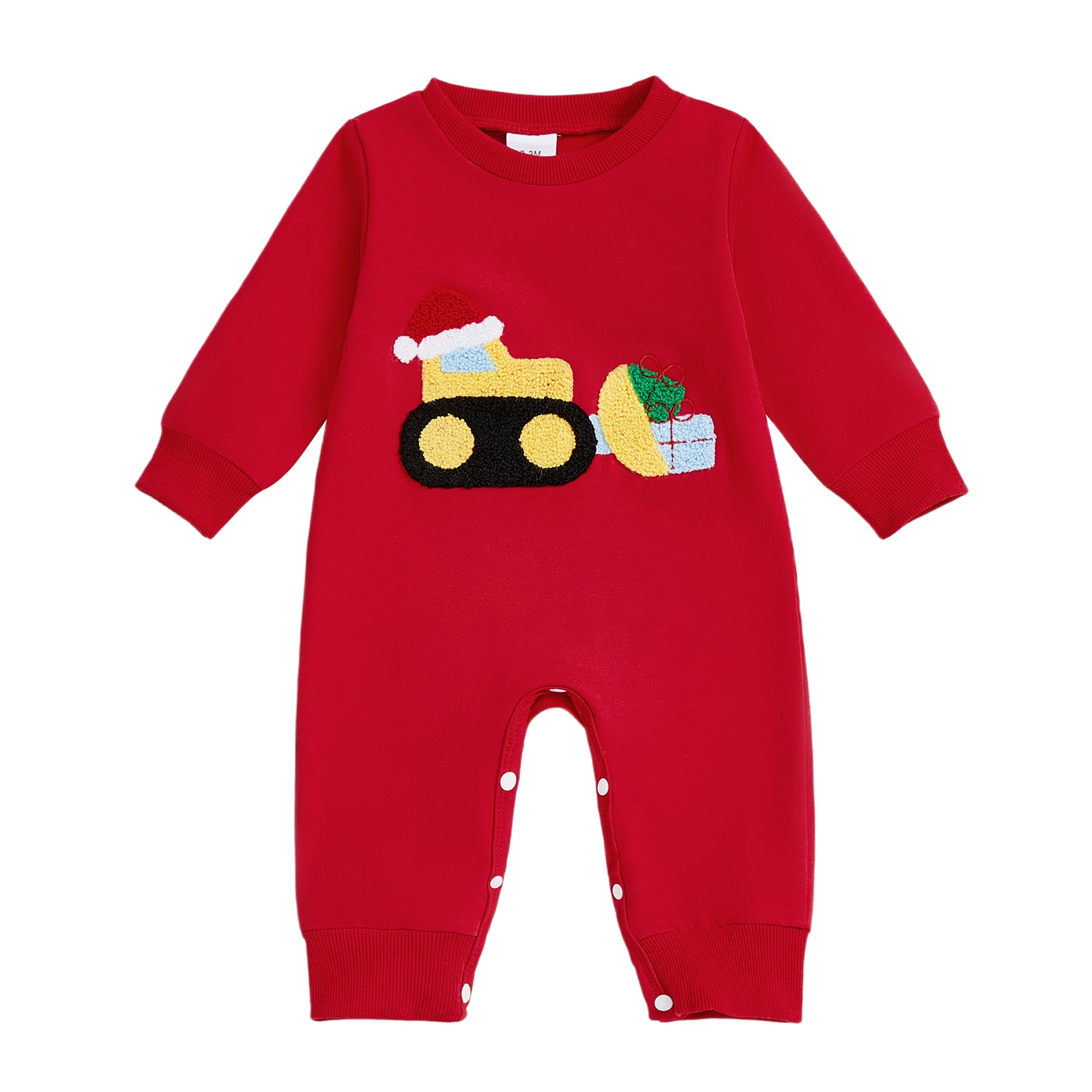 Baby Jumpsuit, Long Sleeve Crew Neck Embroidery Excavator Christmas Romper Clothes for Girls Boys