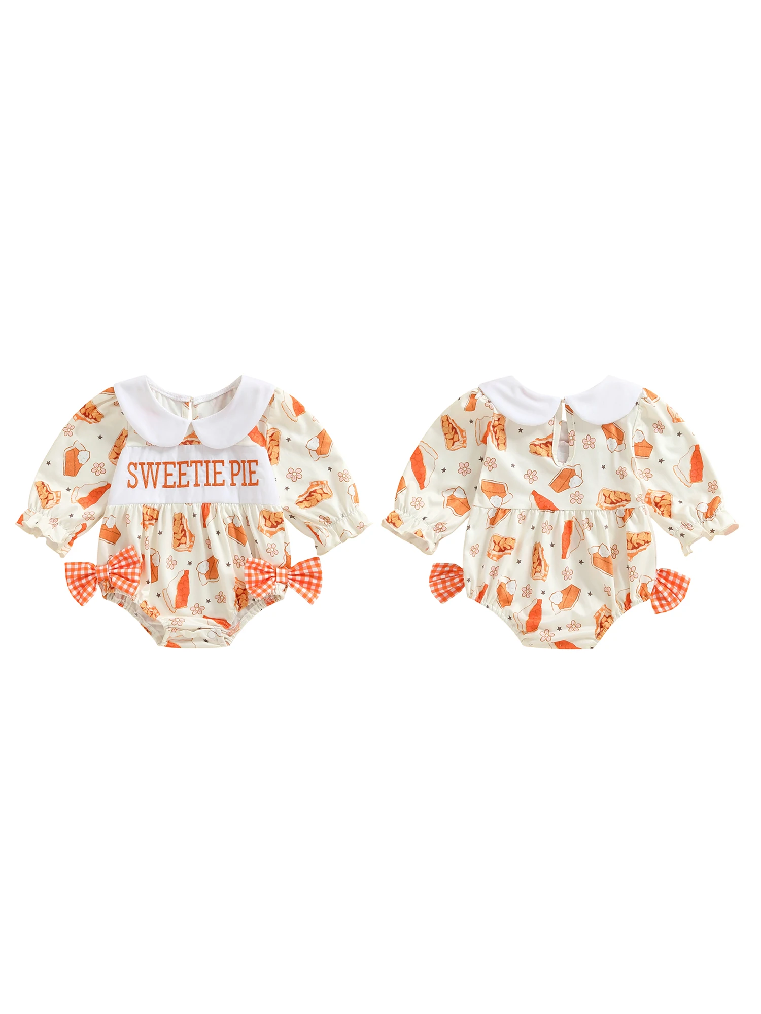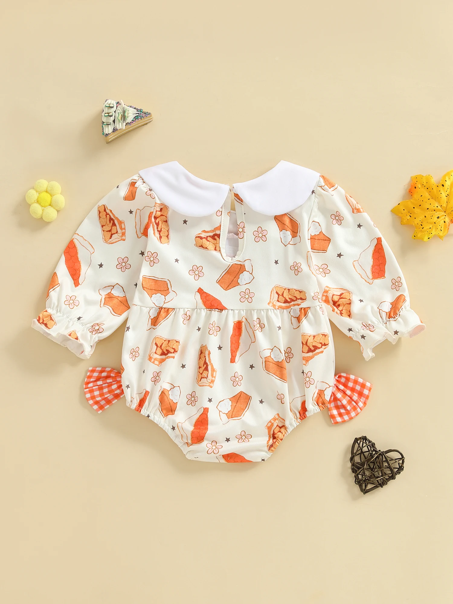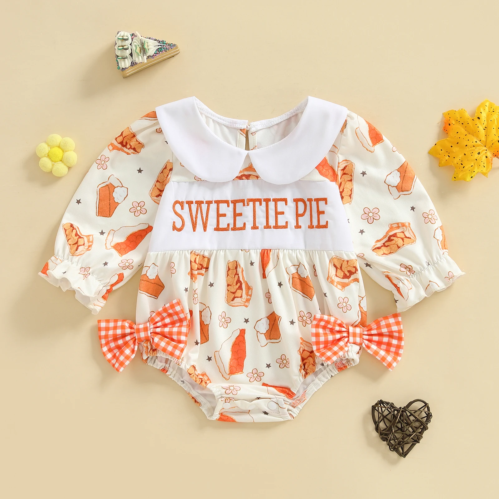 Baby Girl Thanksgiving Romper Cake Print Letter Embroidered Bows Doll Collar Long Sleeve Jumpsuit for Fall