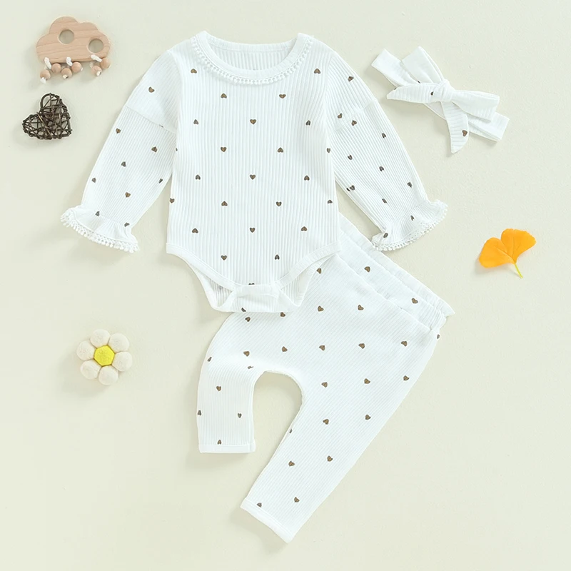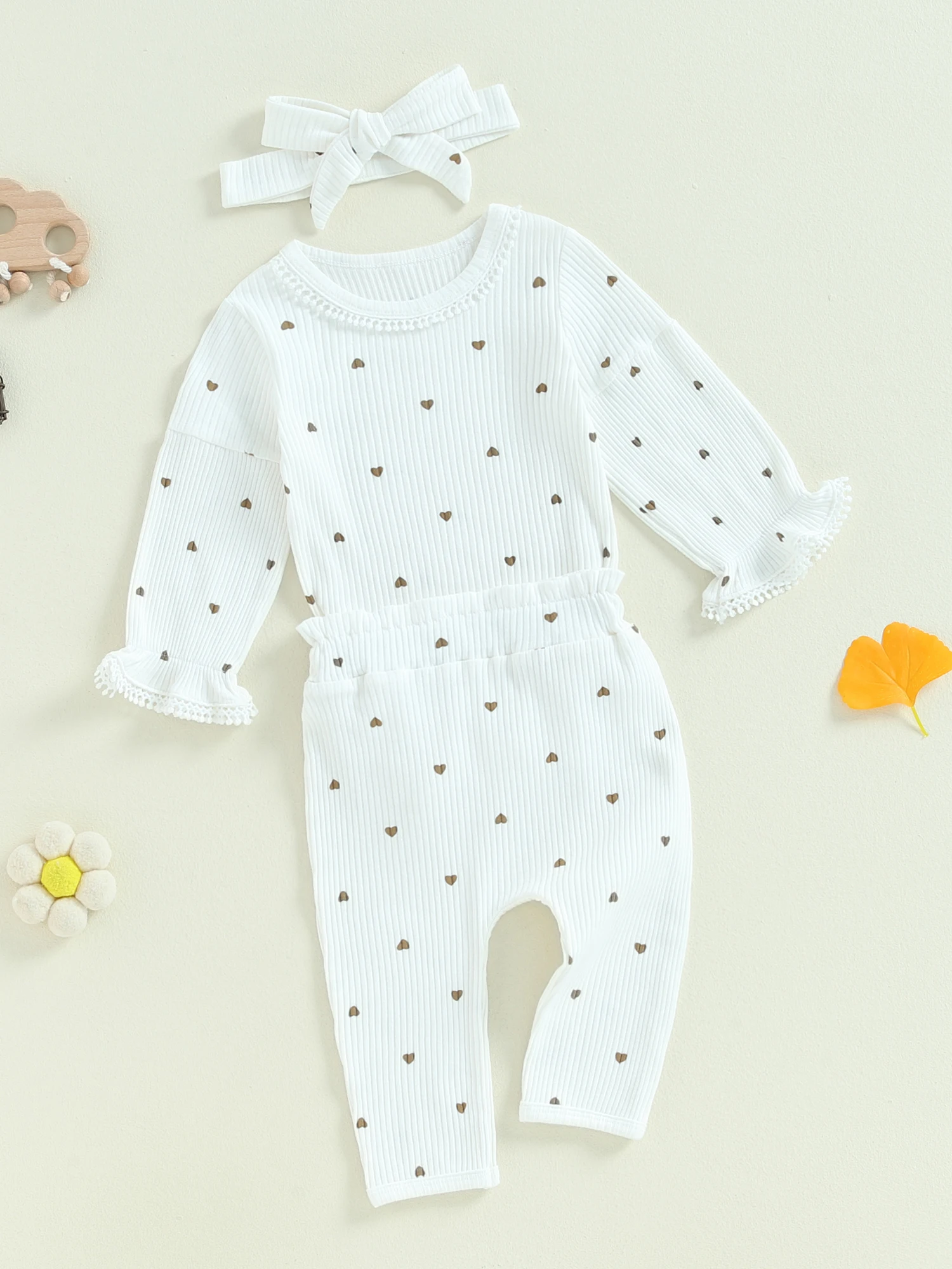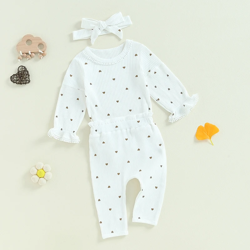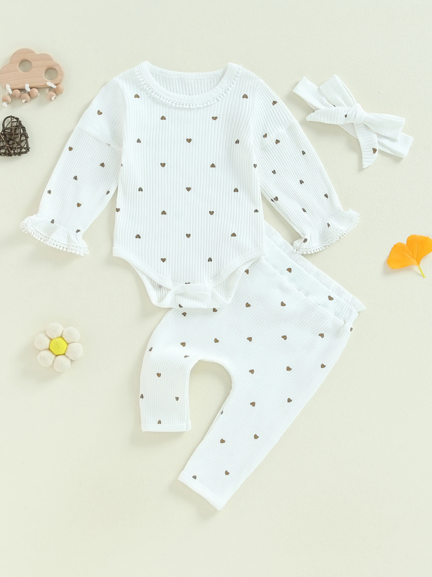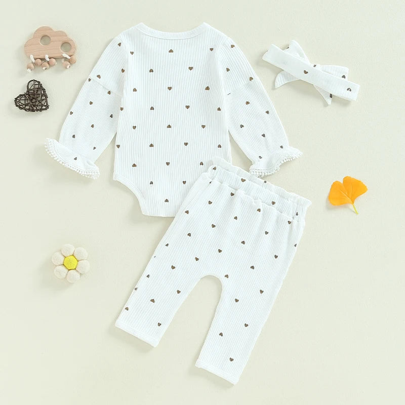 Baby Girl Fall Outfit Heart Print Long Sleeve Crew Neck Romper with Long Pants and Headband 3 Pcs Set