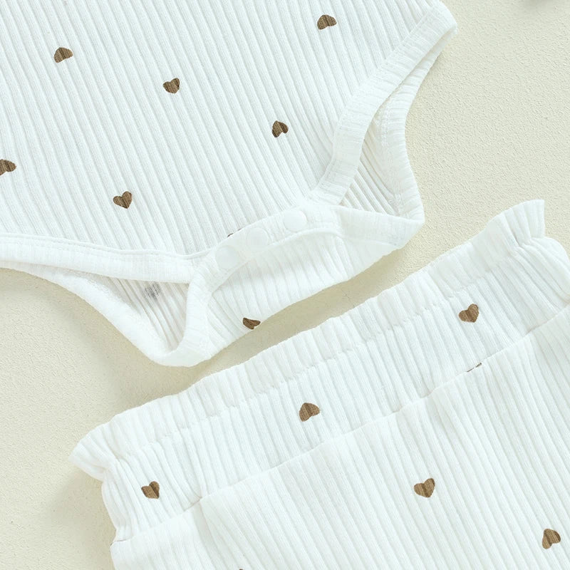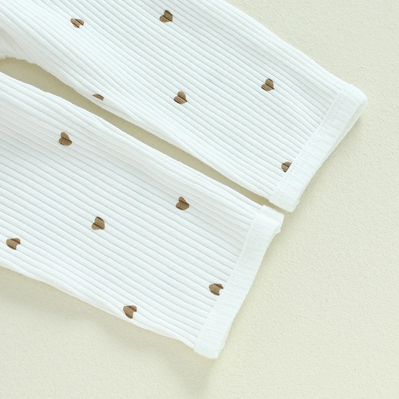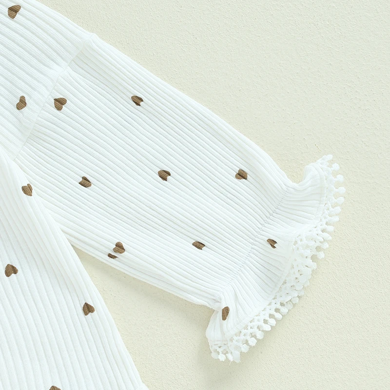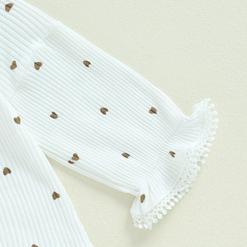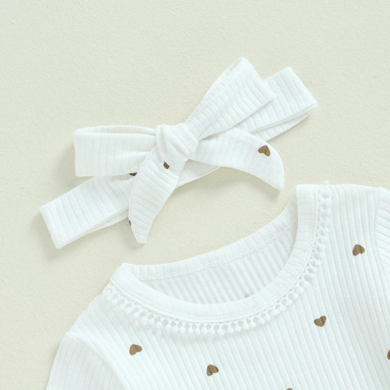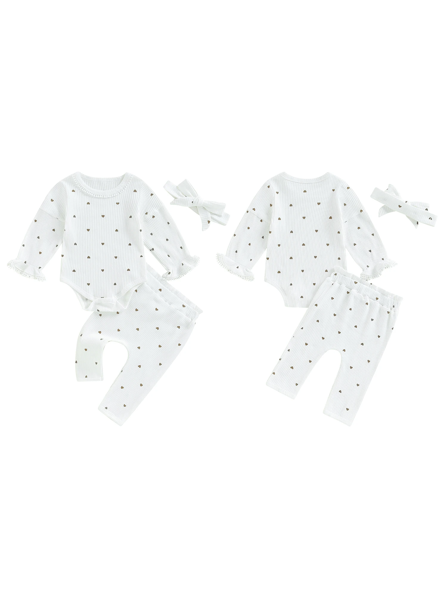 Baby Girl Fall Outfit Heart Print Long Sleeve Crew Neck Romper with Long Pants and Headband 3 Pcs Set